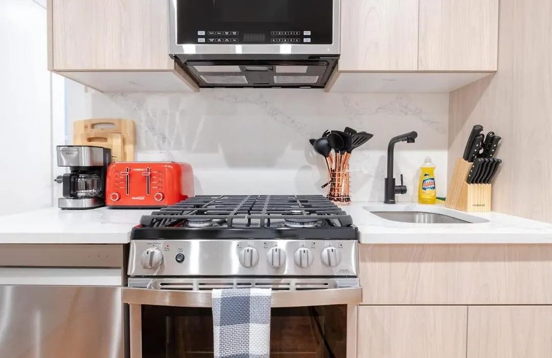 A fully furnished kitchen is featured with a microwave, a refrigerator, and kitchenware, as well as coffee and tea making facilities, ensuring a better dining experience. The 74 m² 323-1 Specious 2Br Williamsburg Apartment is also not too far from Graham Avenue underground station.